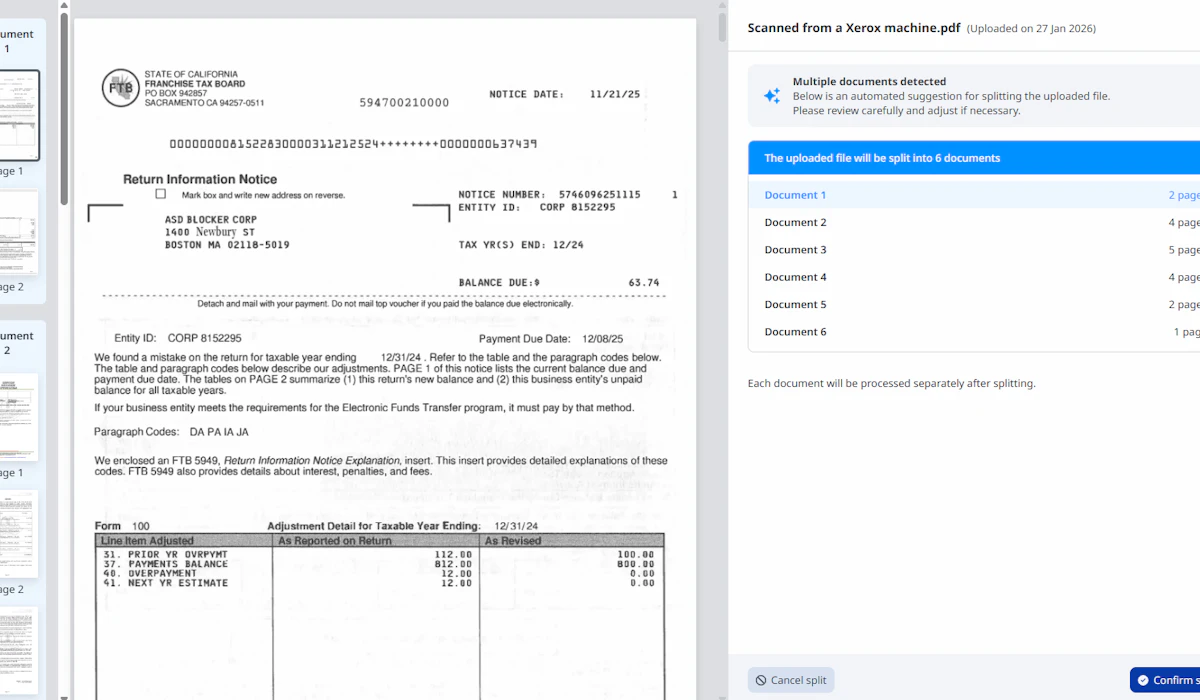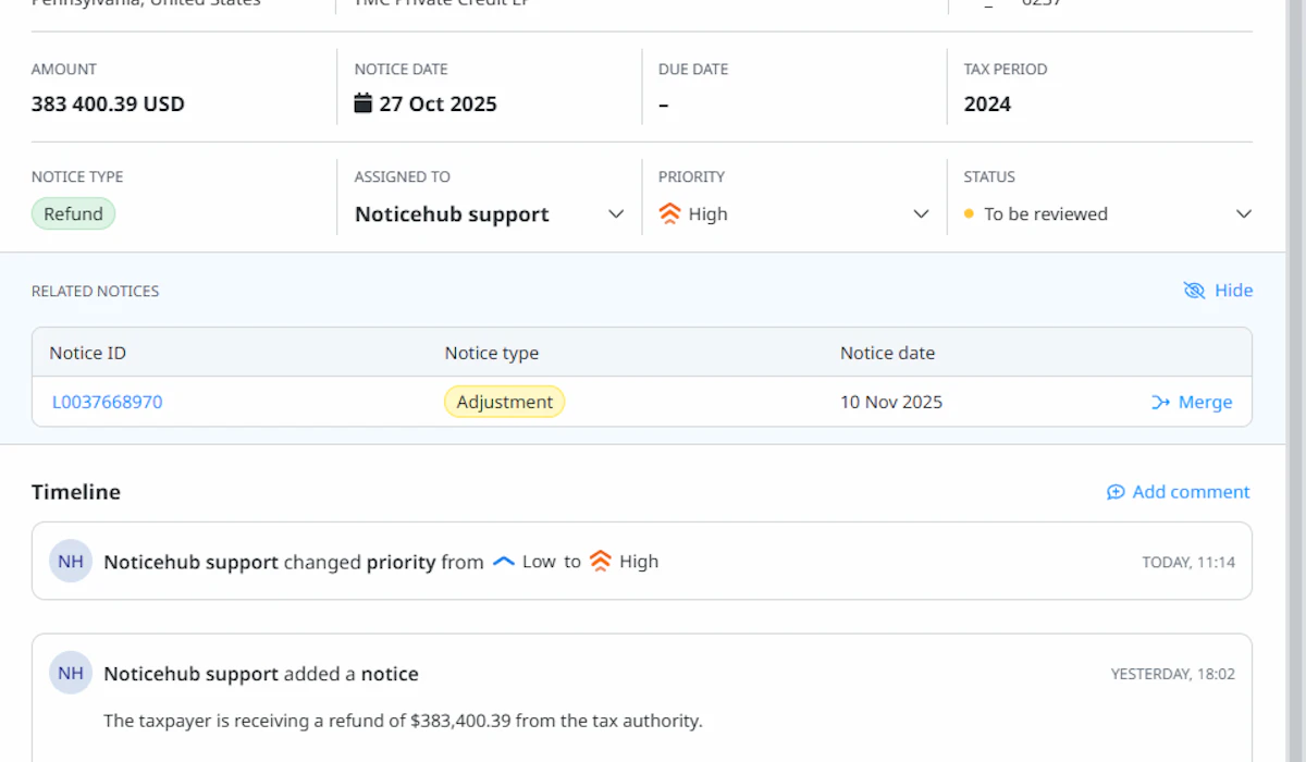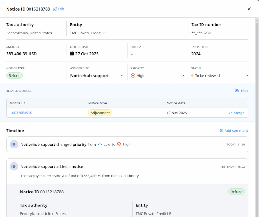 Automatically extract key notice details in seconds, including taxpayer information, tax periods, tax types, amounts, due dates, and issuing agencies. This saves significant time and reduces manual errors, especially at scale, where human data entry becomes slower and more error-prone.