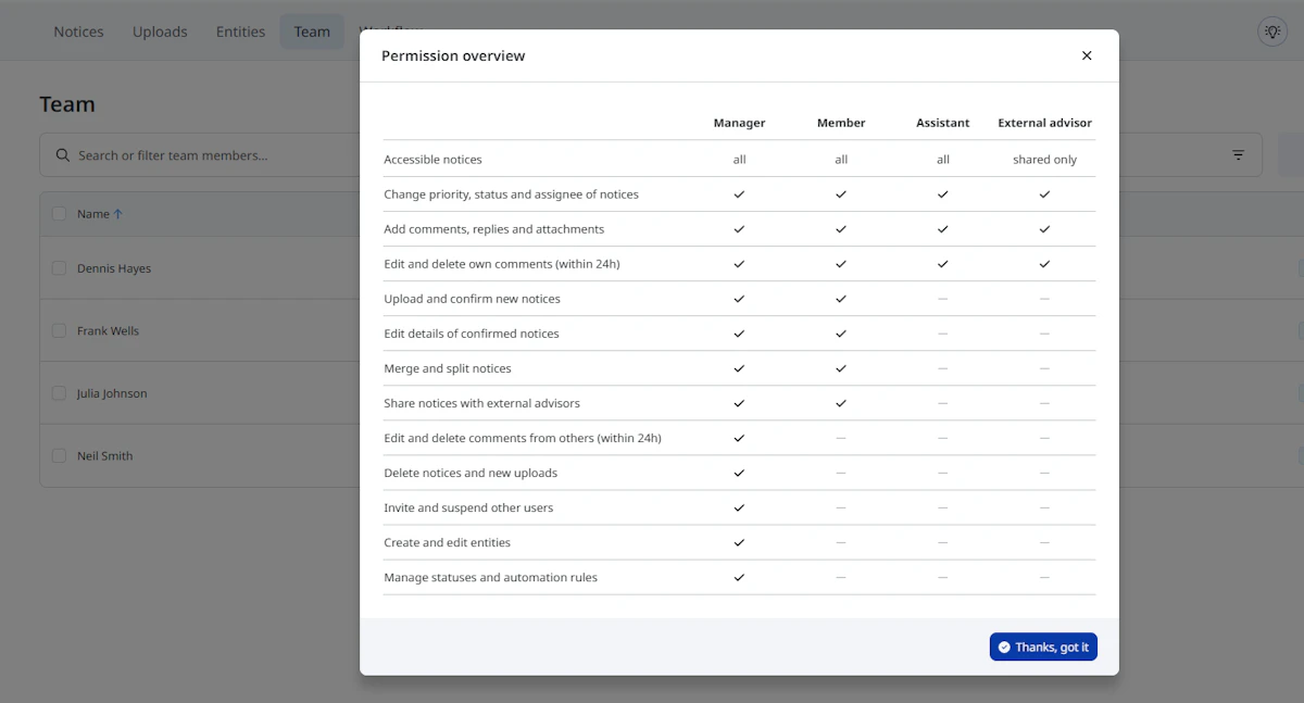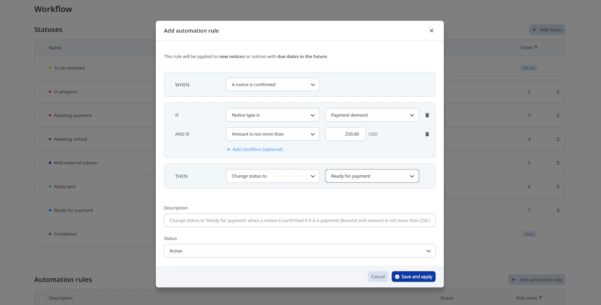 Automatically assign notices, update statuses, set priorities, and manage processing stages using configurable workflows. This ensures consistent handling, clear ownership, and faster resolution from intake through completion.