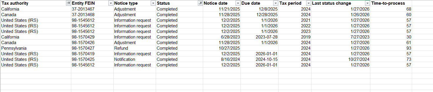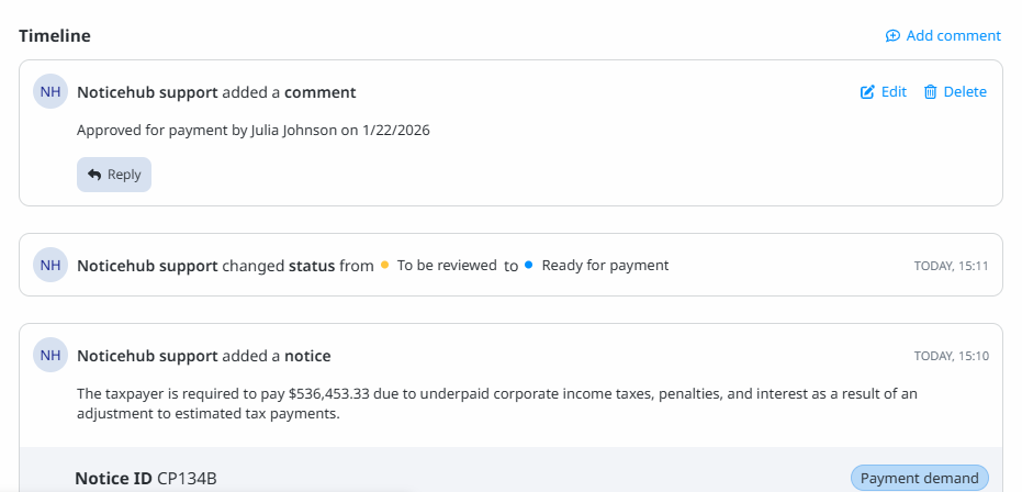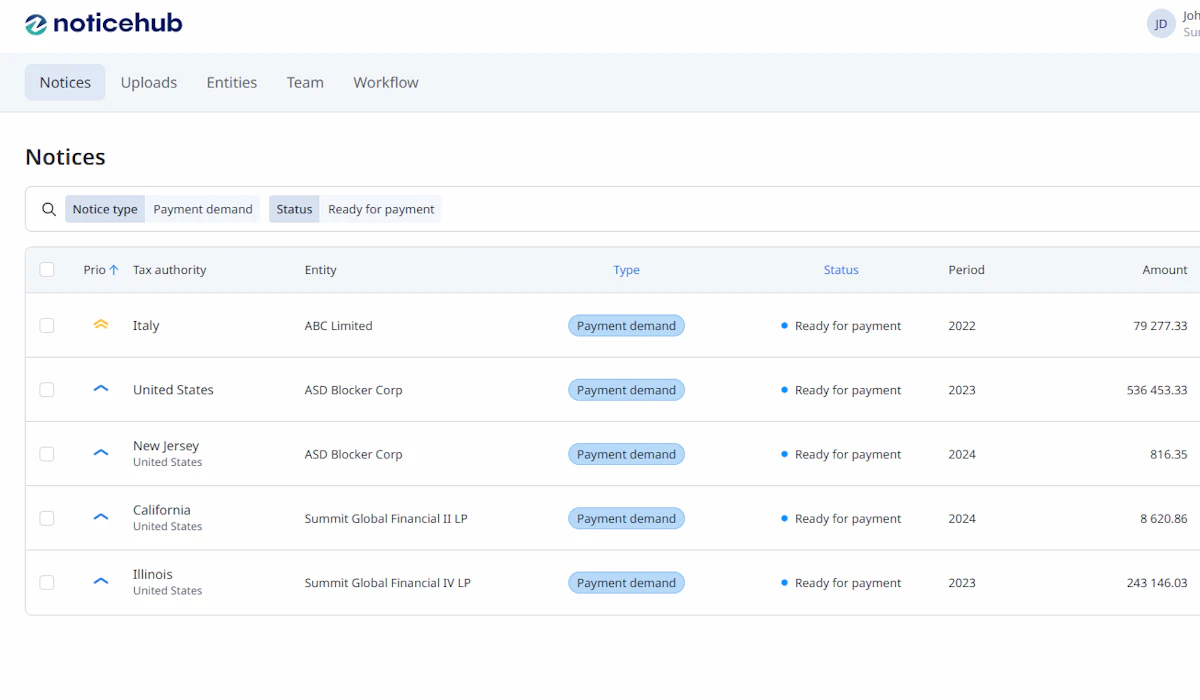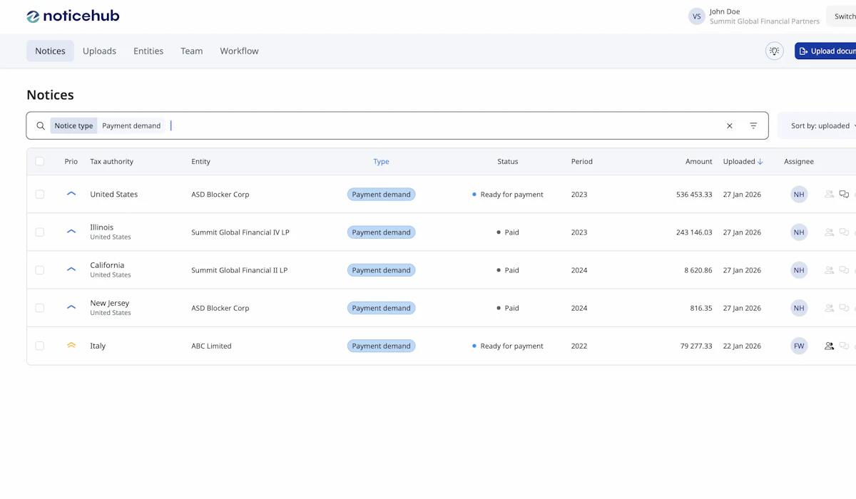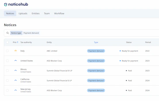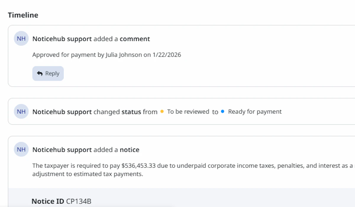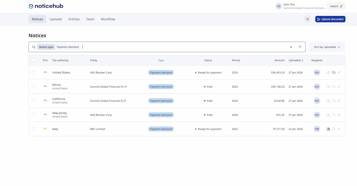 Noticehub gives finance teams timely visibility into notice status, amounts, and deadlines without shifting ownership away from tax teams. Working from a shared source of information reduces surprises and last-minute escalations. This supports more predictable cash outflows and strengthens internal controls around payments and approvals.